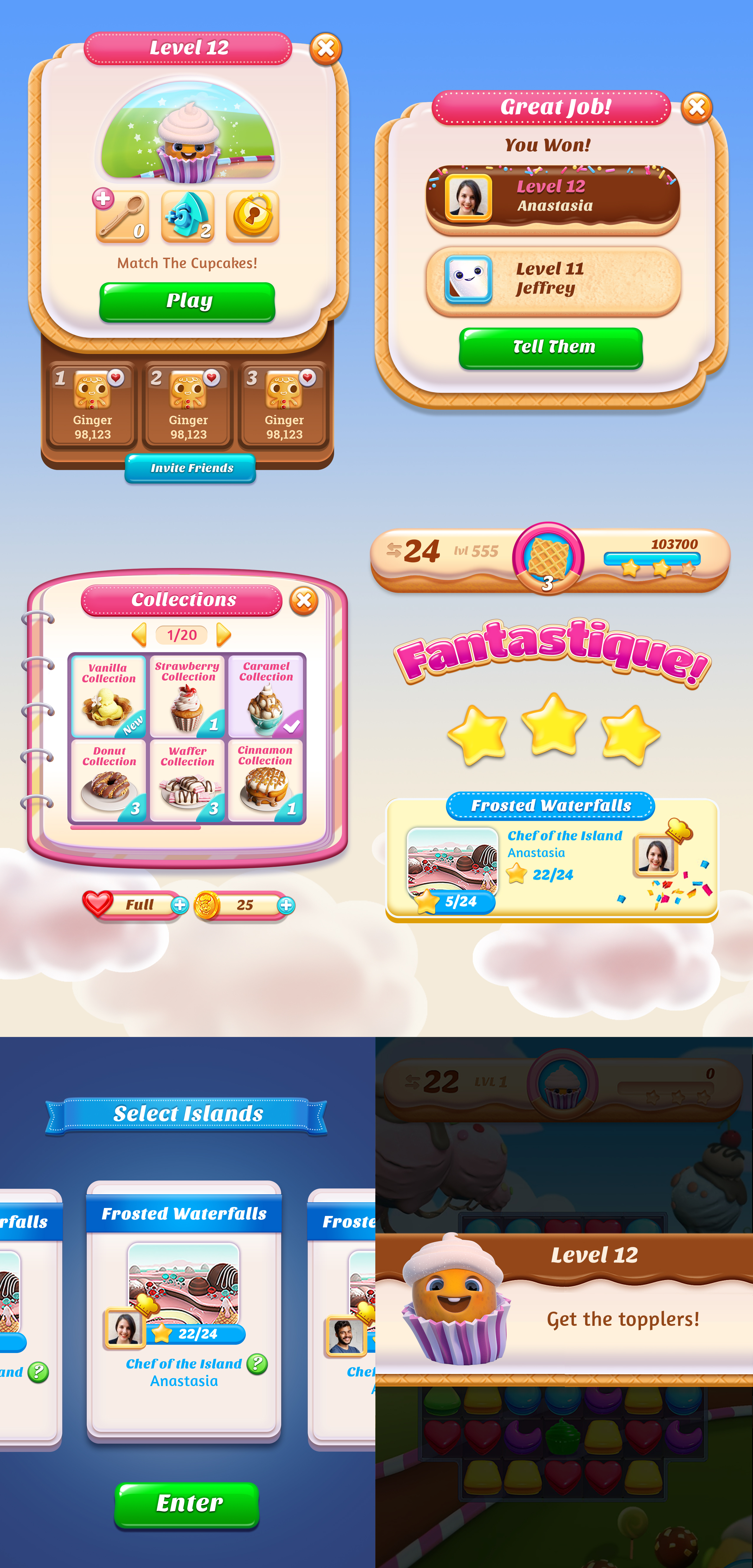 A dessert themed match 3 mobile game by Jam City. Users can collect and bake desserts as they progress through the puzzle levels.